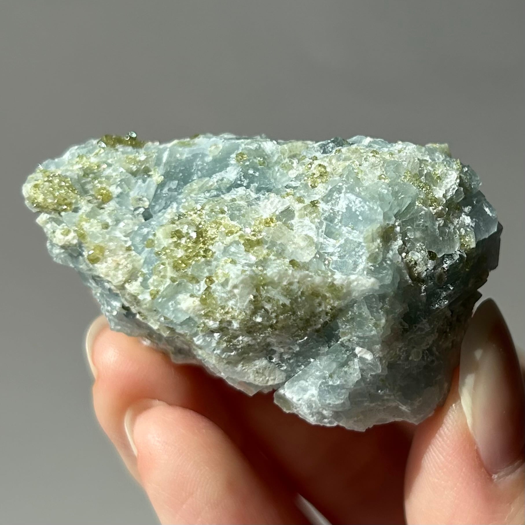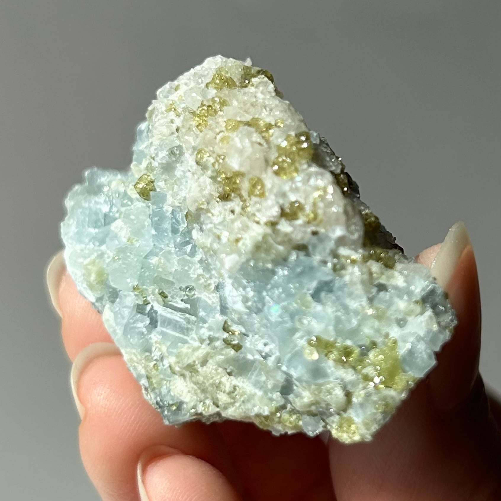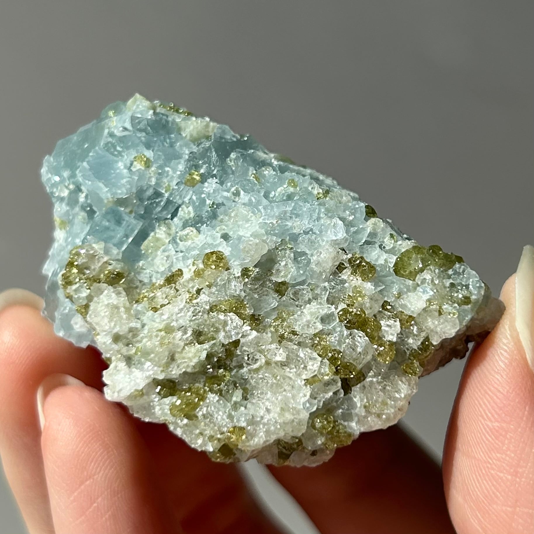 ペリドットの共生(特にマダガスカル産セレスタイトとの組み合わせ)は、薄青色のセレスタイト上に黄緑色のペリドット結晶が点在する、非常に希少な天然石です。